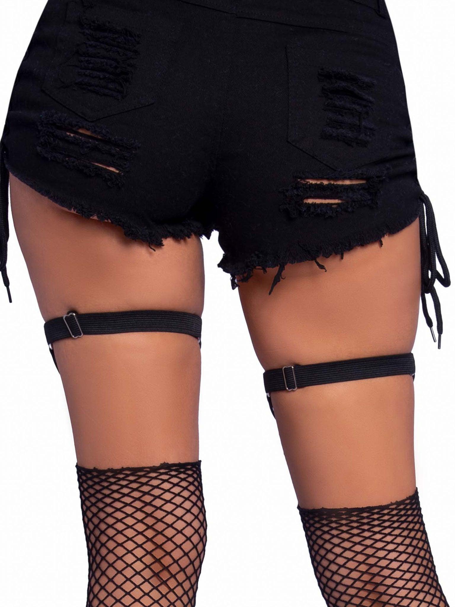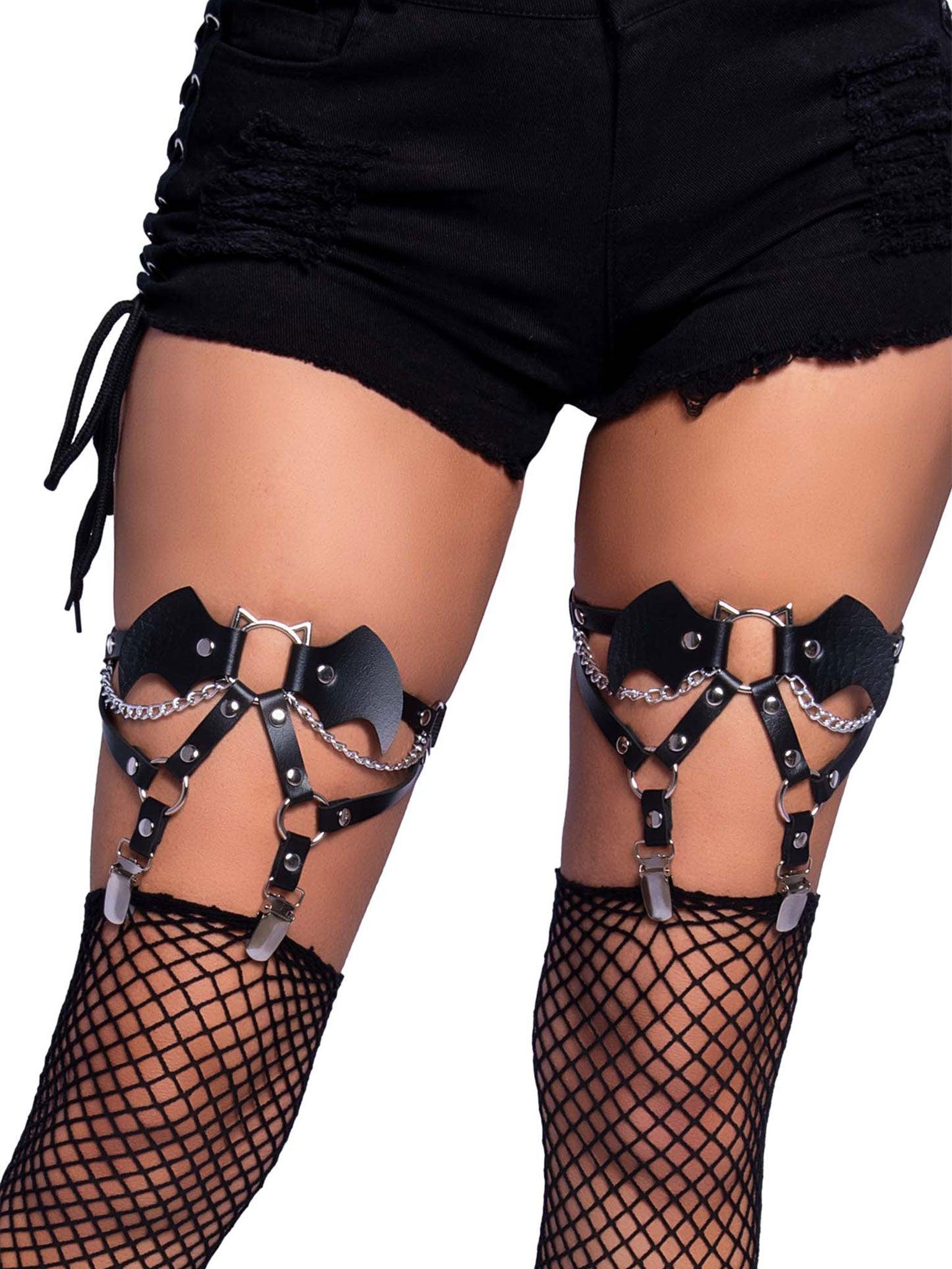 Elevate your festival style with the Bat O-Ring Studded Thigh High Garter Suspender. Crafted from faux leather and featuring striking chain details, these thigh garters boast a unique bat wing design with suspender clips to keep your thigh highs securely in place. The cage strap design, shining silver studs, and charming bat wing accents create a bold and edgy look. Perfect for pairing with any stockings, they ensure you stand out at any event. Complete your rave ensemble with the Zipper Front Bodysuit and Rhinestone Fishnet Stockings for a show-stopping festival outfit.