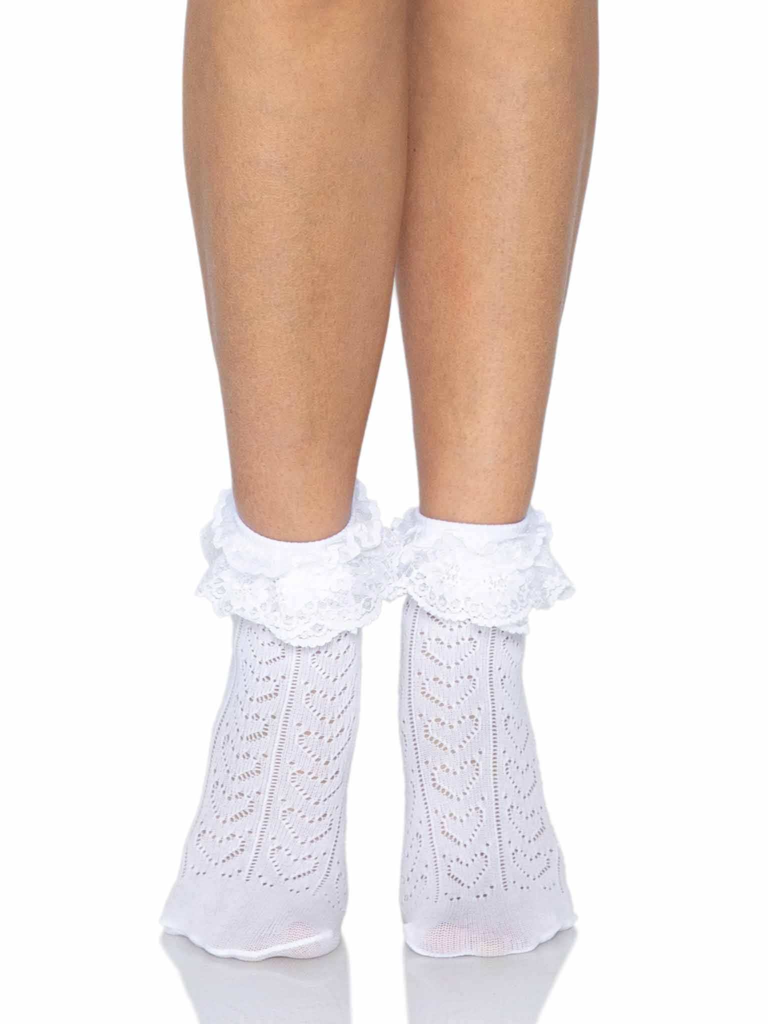 Feel irresistibly sweet with the Lei Lace Ankle Socks. Adorned with a delicate crochet pattern and angelic heart lace at the ruffle, these socks are a timeless addition to your wardrobe. Whether you're pairing them with sneakers for a casual look or with heels for something more polished, they're the perfect blend of elegance and comfort.