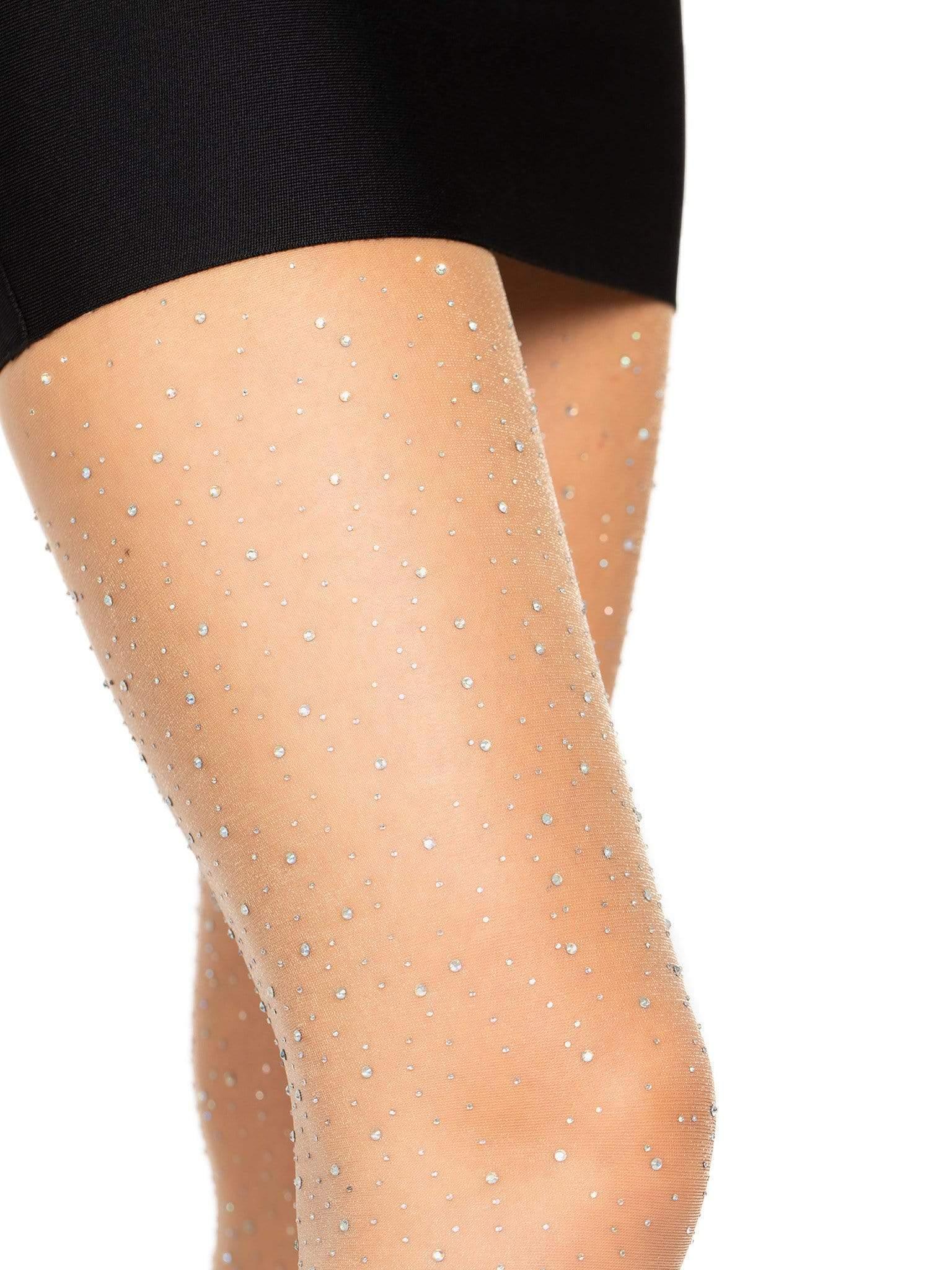 Shine brighter than the stars with these dazzling Spandex Sheer Rhinestone Pantyhose. Crafted from body-forming spandex with an elastic waistband and reinforced toes, these tights are coated in a sprinkle of shimmering rhinestones for a show-stopping effect. Made from a soft and stretchy nylon blend, they offer both comfort and sparkle.