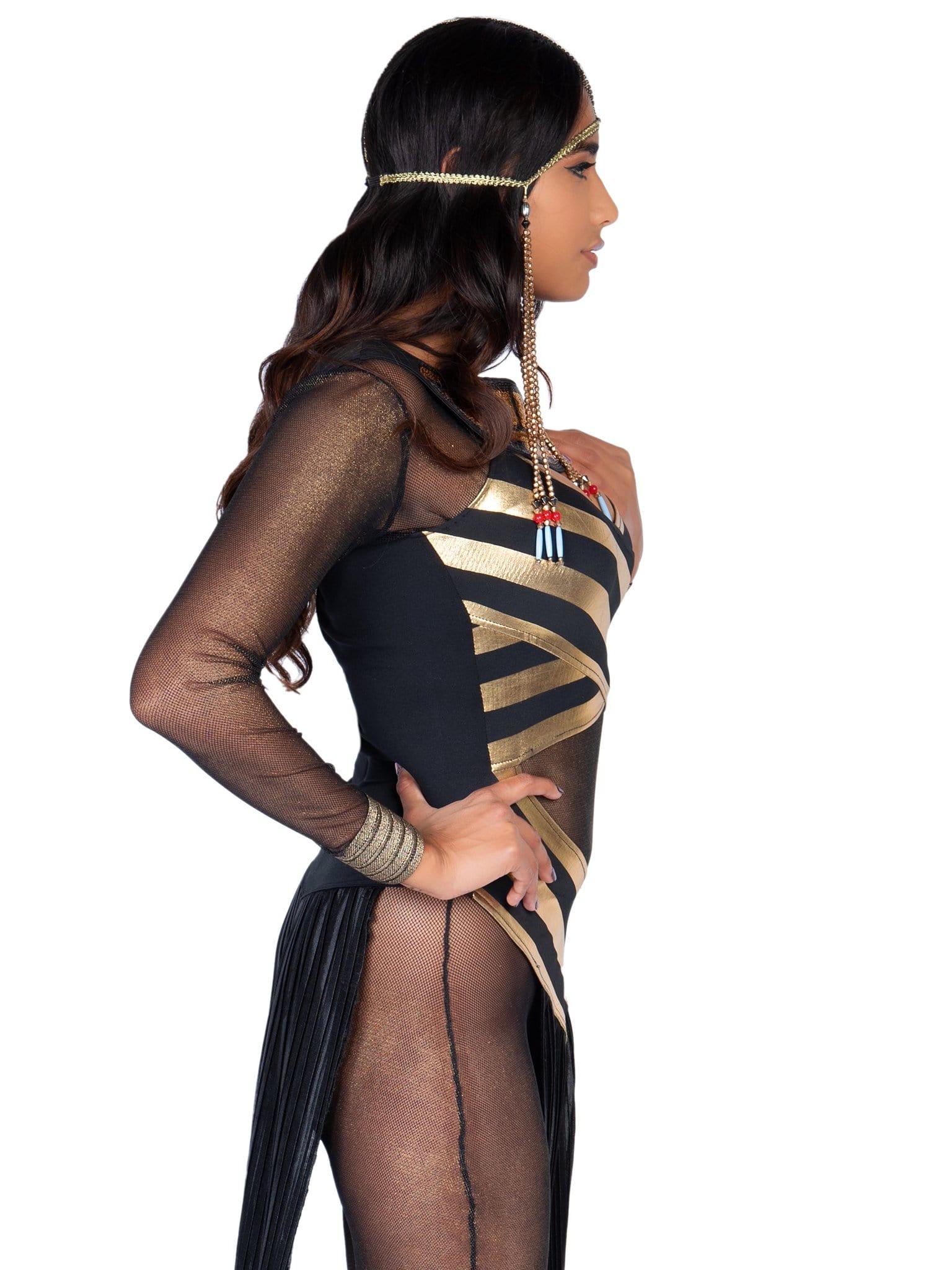 Even the mighty Nile will bend to your will in the provocative Leg Avenue 3-Piece Nile Queen. You’ll bring this legendary beauty to life in the gold shimmer catsuit, striped cut out dress with intricate jewel collar, and matching draped head piece. The contrasting gold stripe cut out dress and stretchy spandex catsuit are sure to flatter all of those commanding curves. To top off this ravishing regal look, this costume kit includes a glistening gold headband with contrasting bead accents.