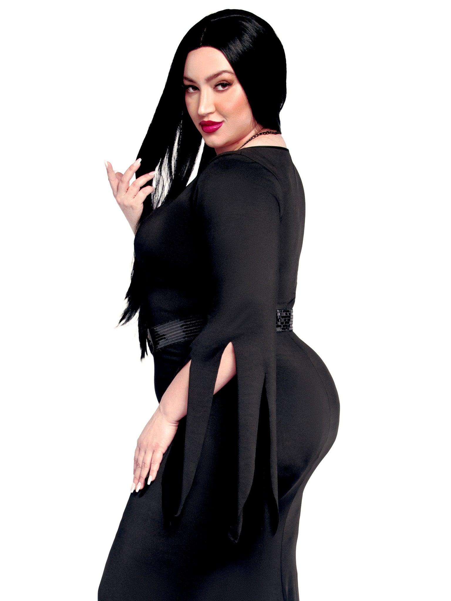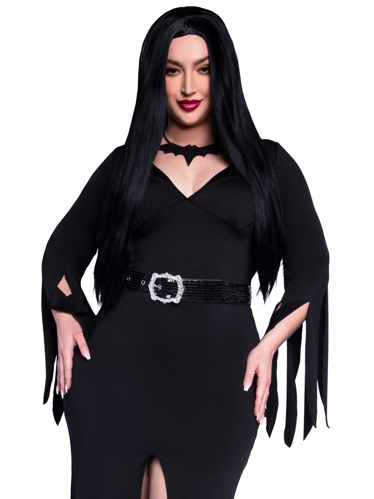 Capture their imagination with the iconic Plus Immortal Mistress Halloween costume from Leg Avenue. This beautiful, figure-hugging outfit is sultry, elegant, and impossible to ignore. Combining a deep-V dress with tentacle hem and tattered sleeves, a sparkling sequin belt, and a glitter bat necklace, this 3-piece costume ensures you'll be the star of the show. Just add your favourite heels and you'll be ready to channel your inner Morticia.