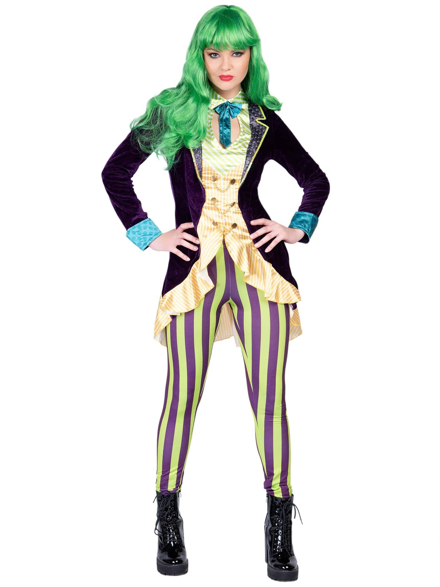Show Gotham who the real clown queen of crime is in the Leg Avenue 2-Piece Wicked Trickster Costume. As filled with detail as it is with mischief, this women Joker costume set features a sequin-trimmed velvet high/low jacket with attached satin bow tie and matching stripped leggings. Distract the bat and dazzle your adoring fans with the bold contrasting coat cuffs, studded faux leather label and glistening coin buttons.