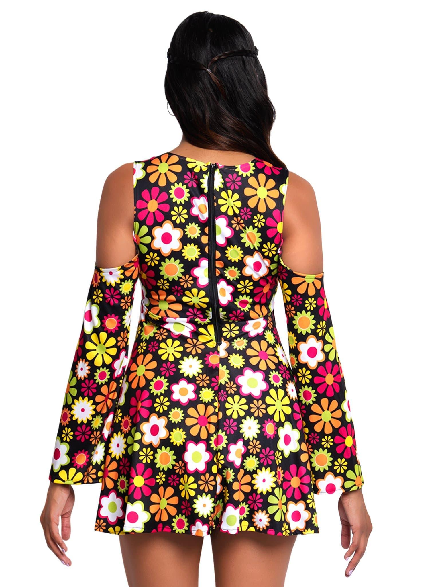 Step back into the summer of ’69 in the Leg Avenue Starflower Hippie Costume Set. This groovy 1960s costume kit includes a cold shoulder fringe dress with peace sign accent and matching flower headband. The flattering fringe frock is complete with an A-line skirt, lace-up neckline and bell sleeves.