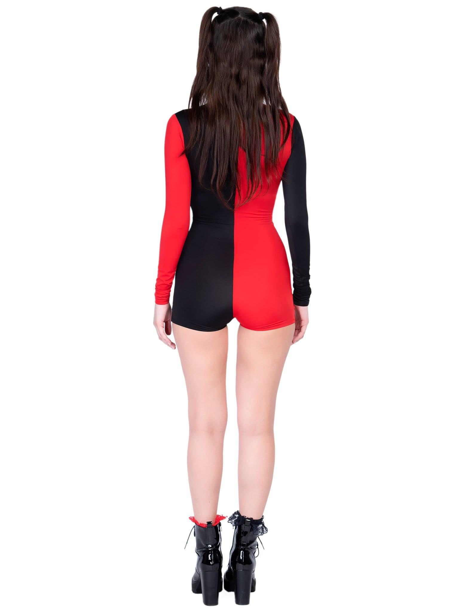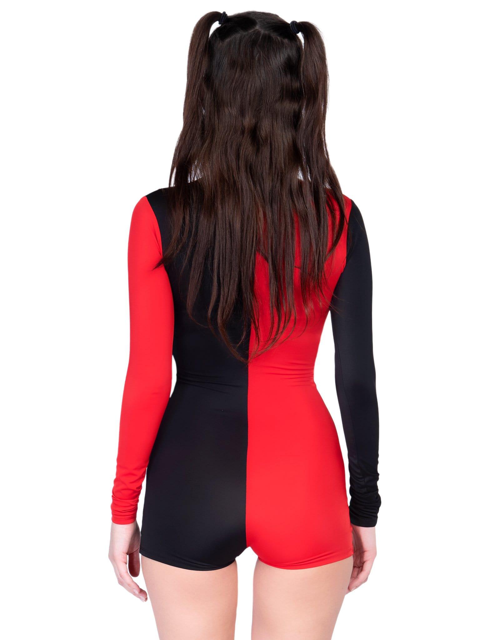 Transform into Gotham’s mischievous queen in the Zipper Front Two-Tone Harlequin Romper. This playful jumpsuit features the classic red and black Harlequin pattern with long sleeves and a seductive zipper front, crafted from soft, stretchy spandex for a comfortable, curve-hugging fit.
