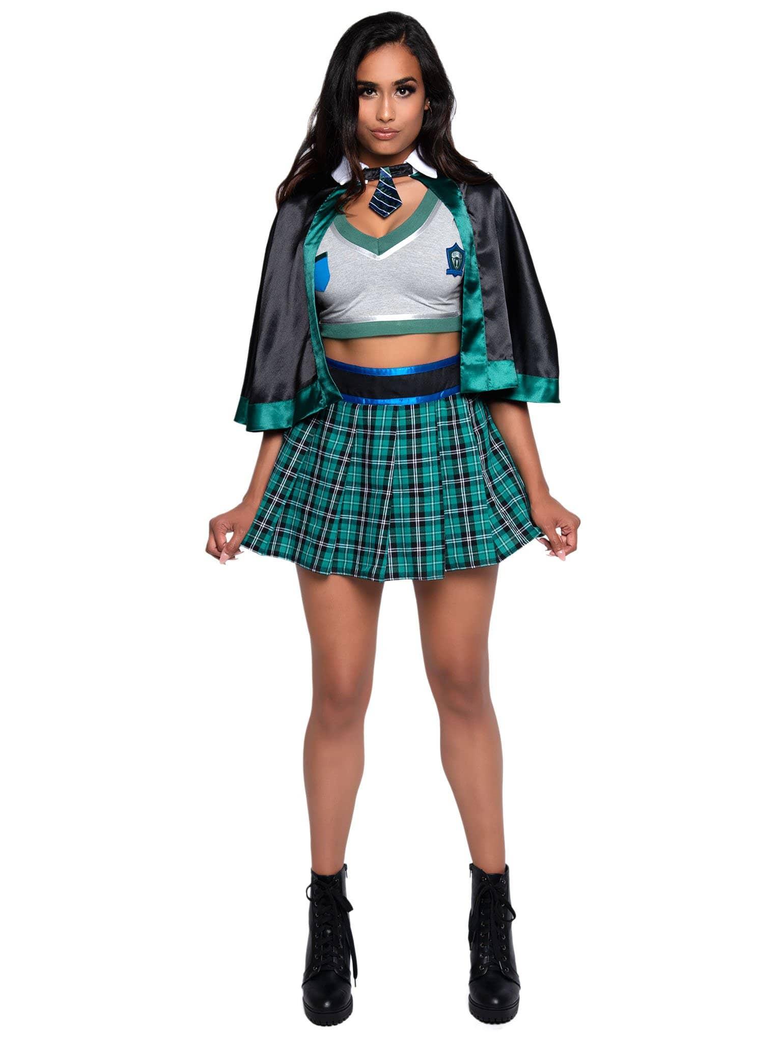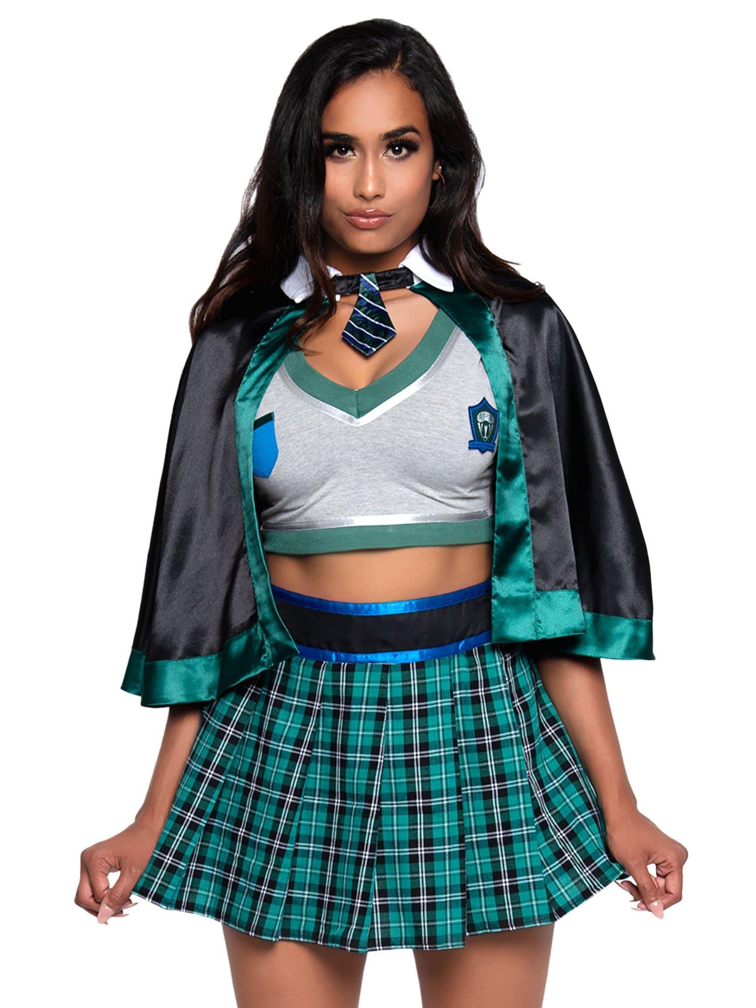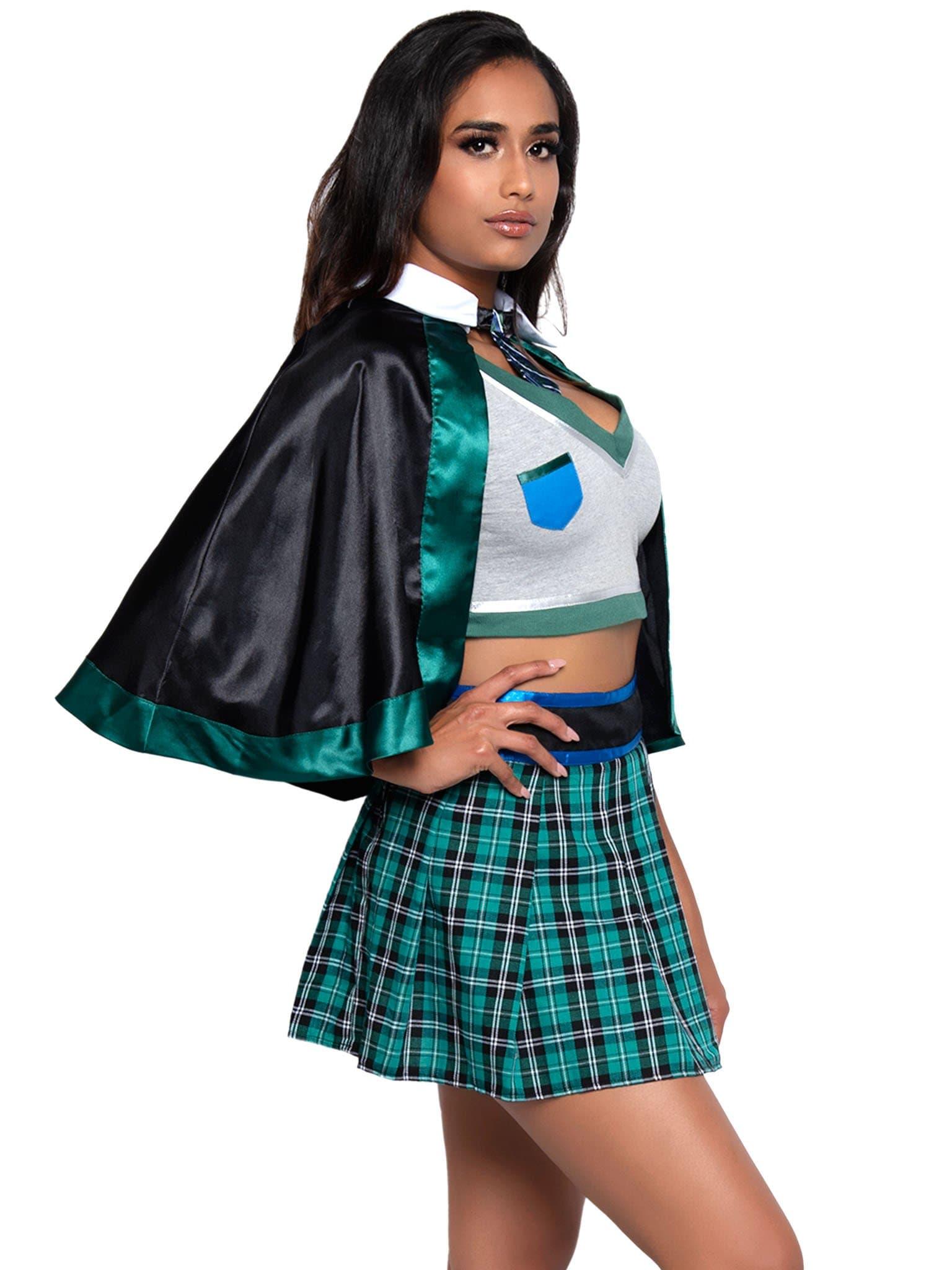 Wands at the ready for the wickedly naughty Leg Avenue 3-Piece Sinister Spellcaster School Girl Costume Set. This magical costume kit includes a fitted crop top with badge accents, high waisted plaid skirt and cape with attached tie. For a magically flattering fit on almost any figure, this sexy school girl uniform is complete with a fluttering high waisted skirt and stretchy deep-v crop top.