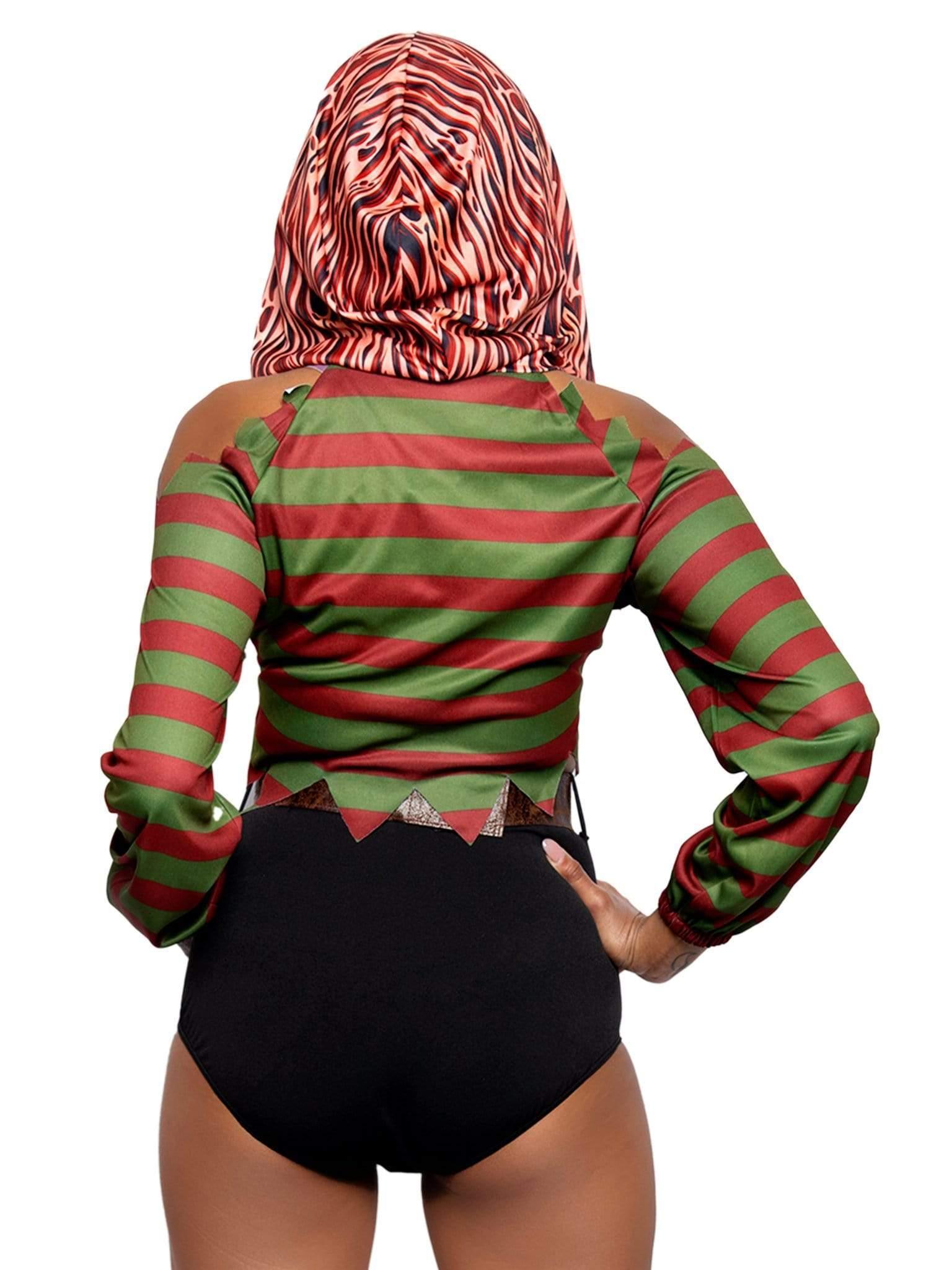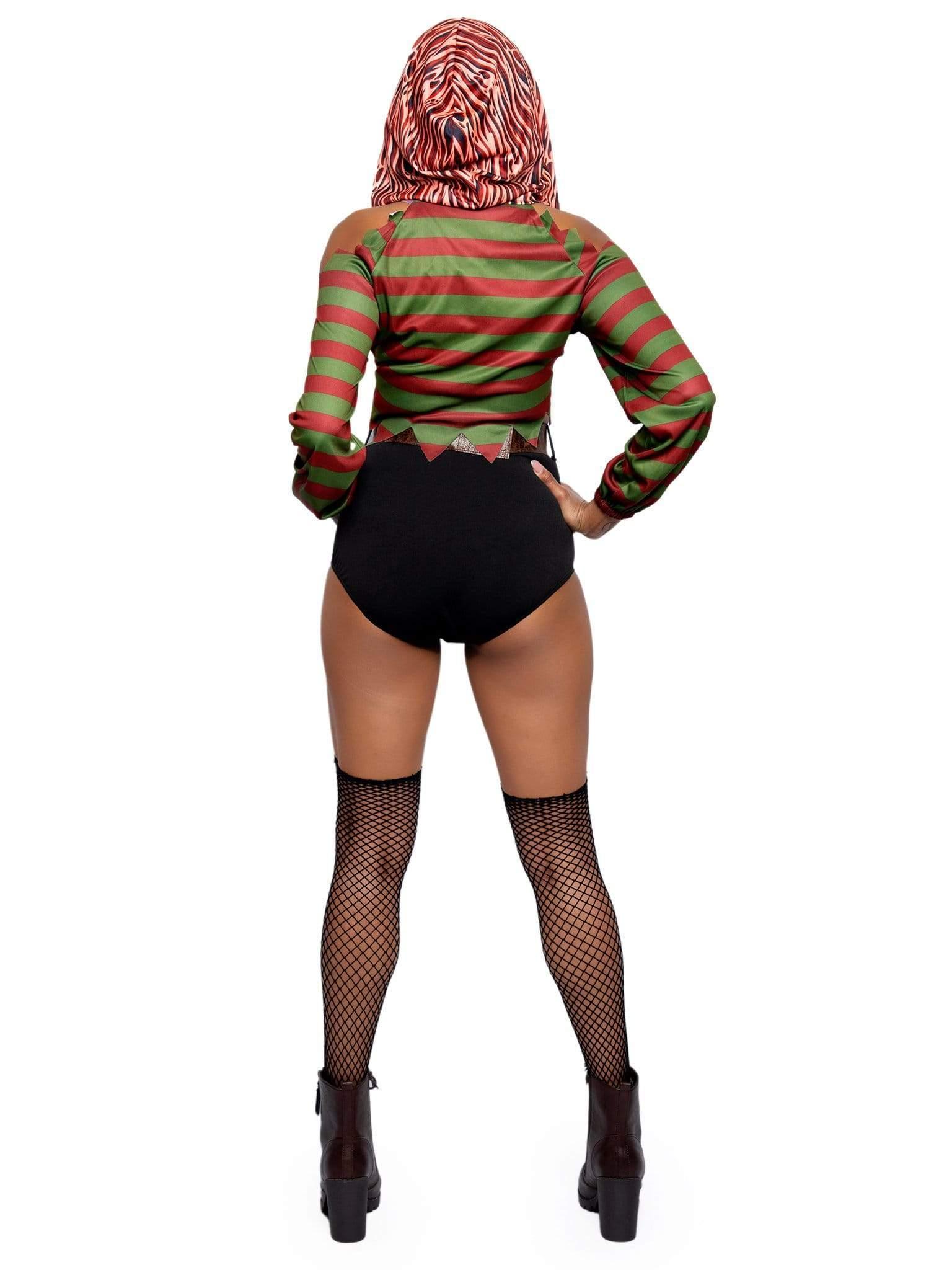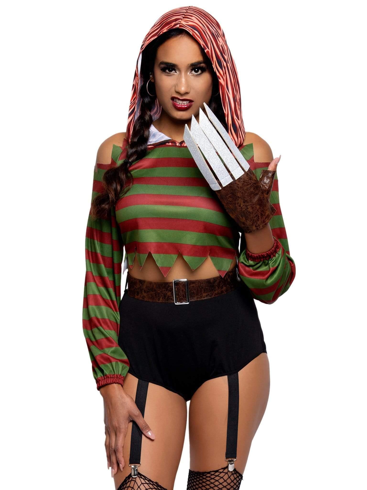 Take your nightmarish revenge and look mighty fine doing it in the Leg Avenue 4-Piece Dream Killer Costume Set. Embody the master of nightmares in this iconic costume set featuring a cold shoulder crop top with burnt skin hood, garter shorts, belt, and foam blade gloves. This curve hugging fabric, sexy cold shoulder detail and cheeky cut shorts are sure to flatter almost any little killer’s figure.