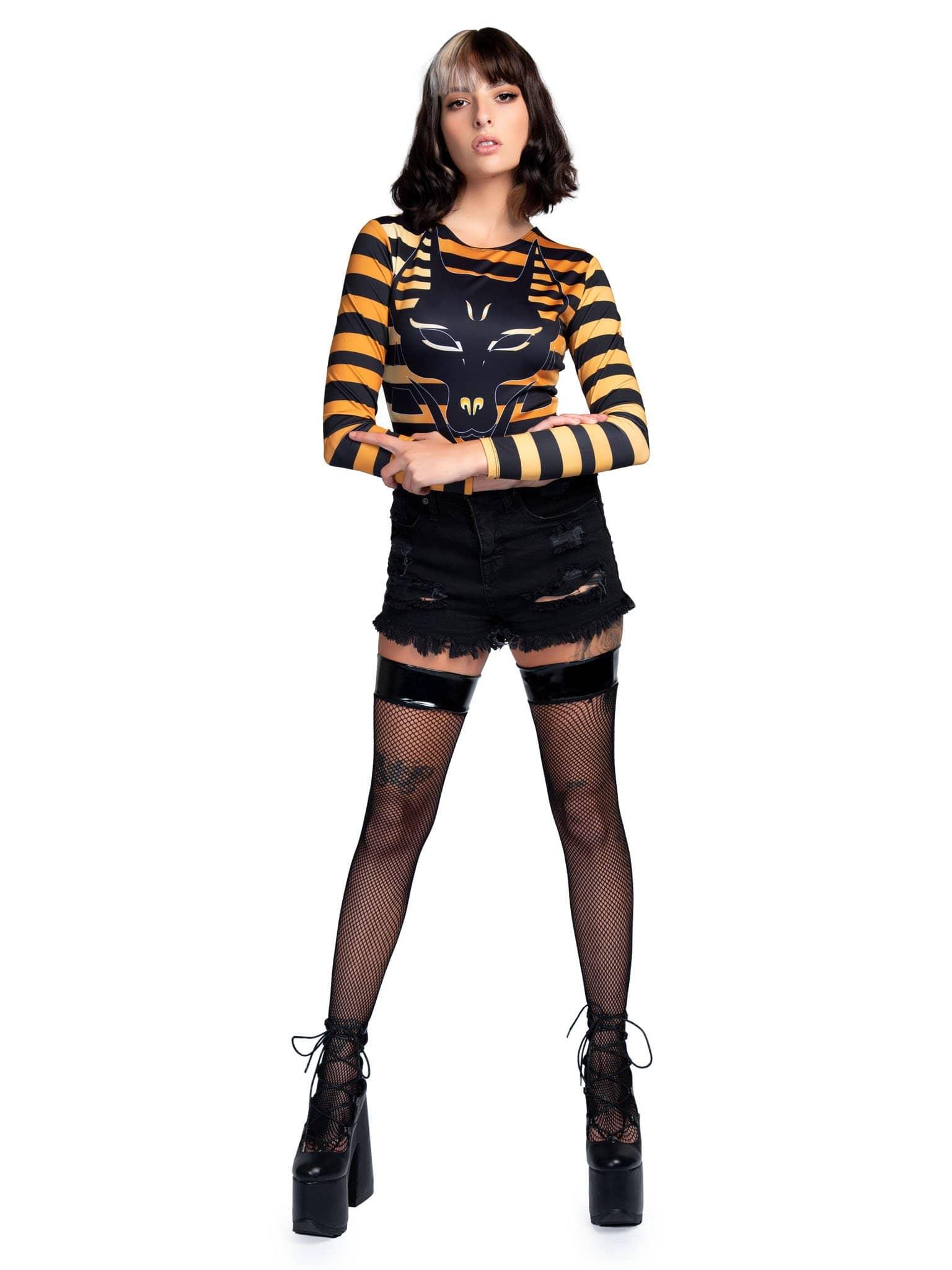 Who knew the goddess of the dead was so gorgeous? Take your rightful place as queen of the underworld in the gorgeous Goddess Anubis costume. This otherworldly beauty look features a contrasting stripped snap crotch bodysuit with Anubis face print. The contrasting stripe bodysuit is made to flatter all those commanding curves with the stretchy, form-fitting fabric and cheeky cut.