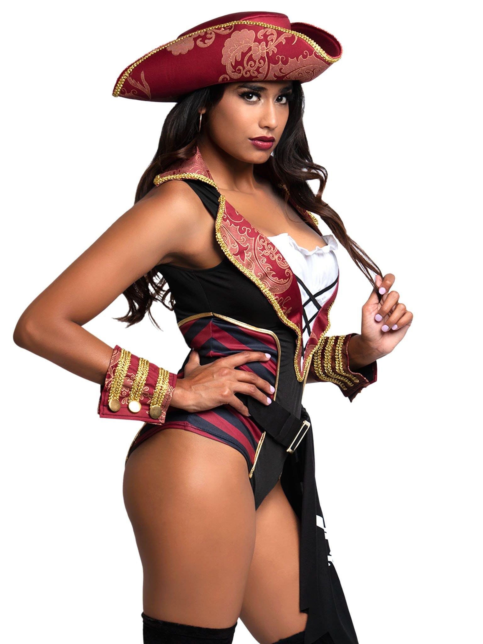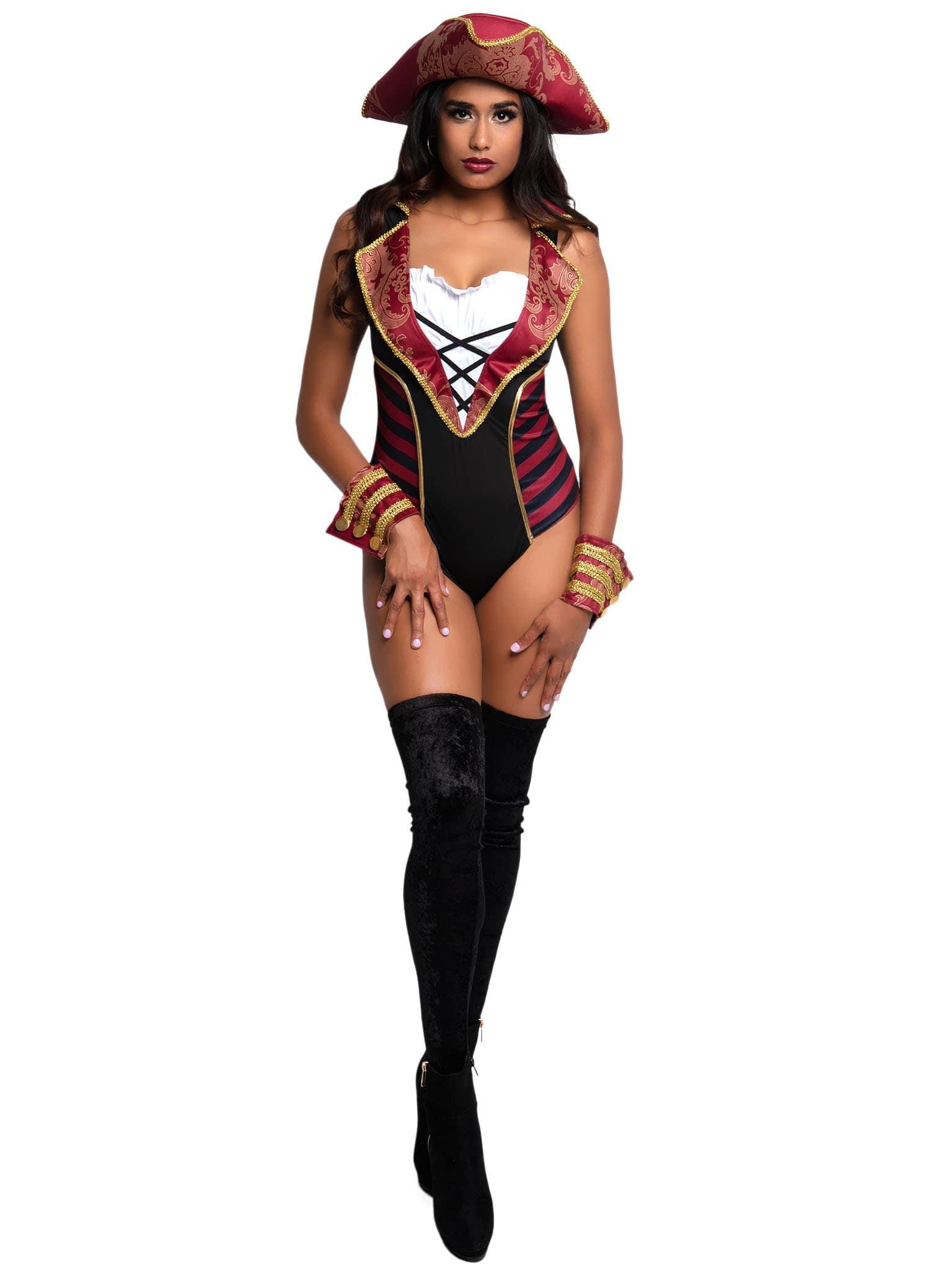 Sail the seven seas in style in the sexy Leg Avenue Swashbuckler Costume Set. This buccaneer beauty outfit kit includes brocade collared bodysuit, pirate flat belt, wrist cuffs, and brocade pirate hat. Show off that pirate booty in the ultra-sexy cheeky bodysuit with waist defining striped panels and eye-catching gold trim. Top off this this sea-worthy pirate costume look with the matching brocade hat, pirate flag belt and gold button cuffs.
