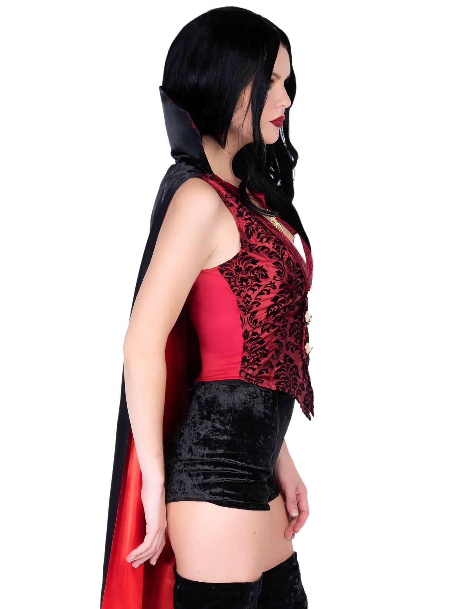 Embody magically charming vibes and darkly seductive energy in the Leg Avenue 3-Piece Bloodthirsty Vamp Costume Set. This gothic-inspired vampire costume set includes a velvet flocked brocade vest, velvet shorts, lined satin cape with stay up collar, and medallion necklace closure. For a classic horror feel, the double layered satin lined cape is finished with a blood red satin, brocade stand up collar and gemstone medallion enclosure. Lux and luscious, the body-forming crushed velvet shorts and brocade vest are sure to hug your curves just right. Exclusive size extra small (X-Small) only sold on Pixie Sparkle!