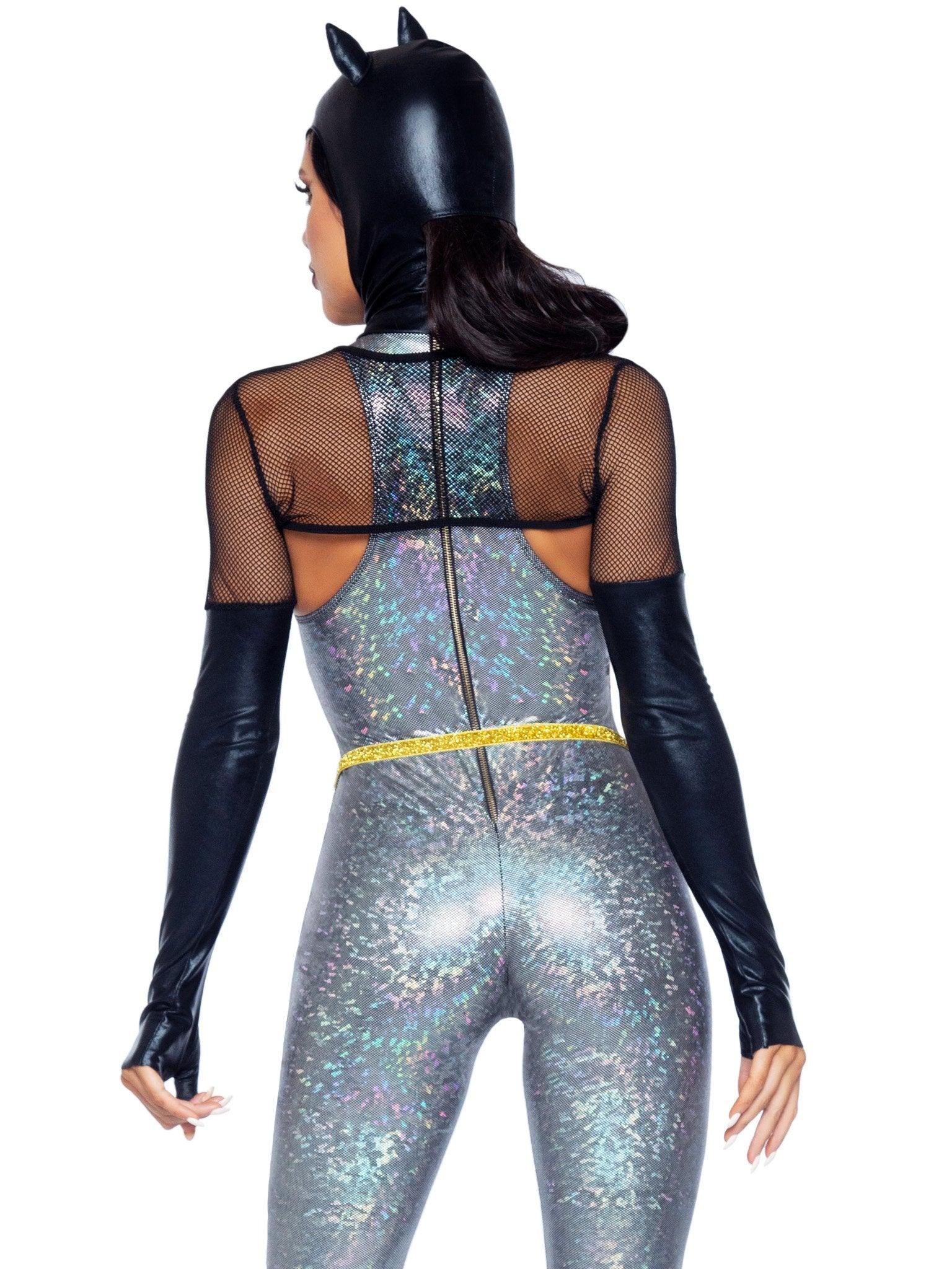 You're sure to cause chaos in Gotham with the wickedly hot Leg Avenue 4-Piece Feline Felon Costume Set. This sexy comic book villain costume kit includes a holographic catsuit with boot detail, fishnet gloved shrug, cat ear skull cap, and belt.