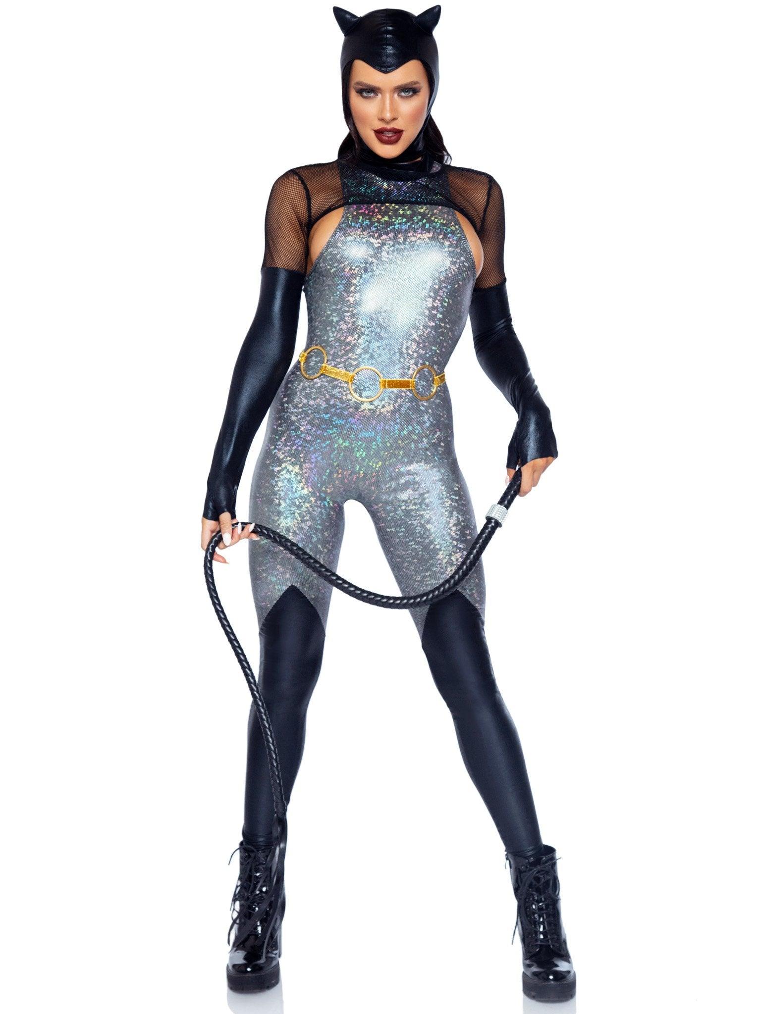 Being bad never looked so good in the curve-hugging holographic catsuit and fishnet gloved shrug that flatters almost any figure. Top off this classic cat burglar costume with the cat ear skull cap and waist belt.