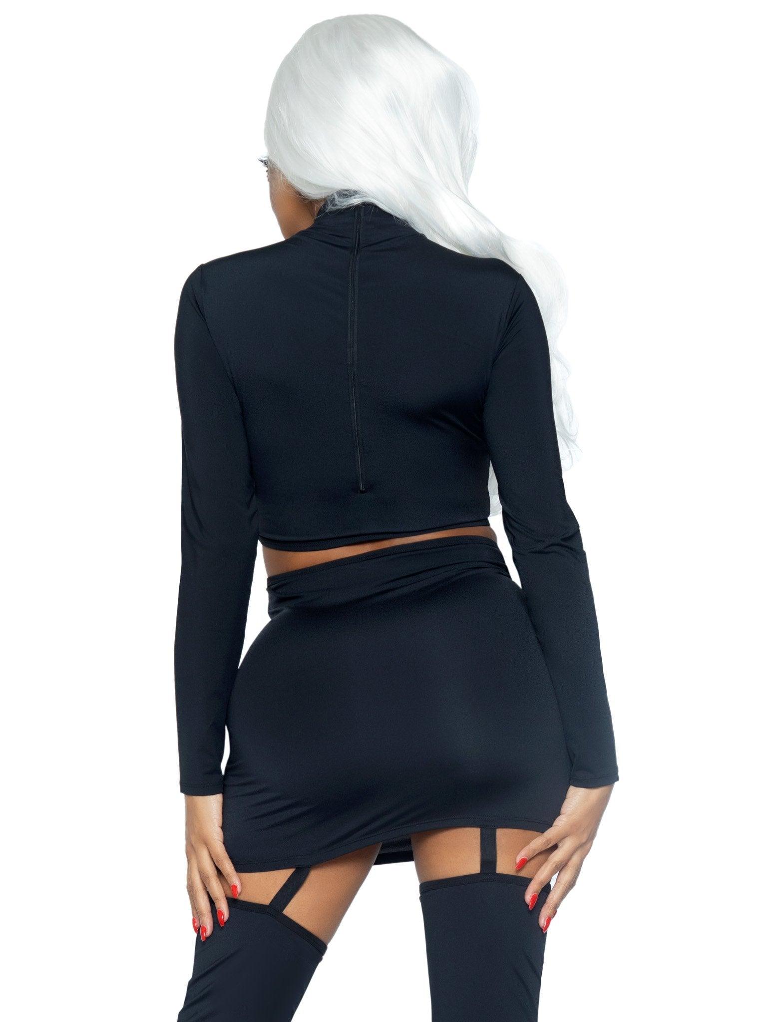 Stunning a stunning silhouette in the curve-hugging crop top and matching high waist skirt with eye catching garters and stockings. Stand out in the crowd with the sparkling gold skeleton design.