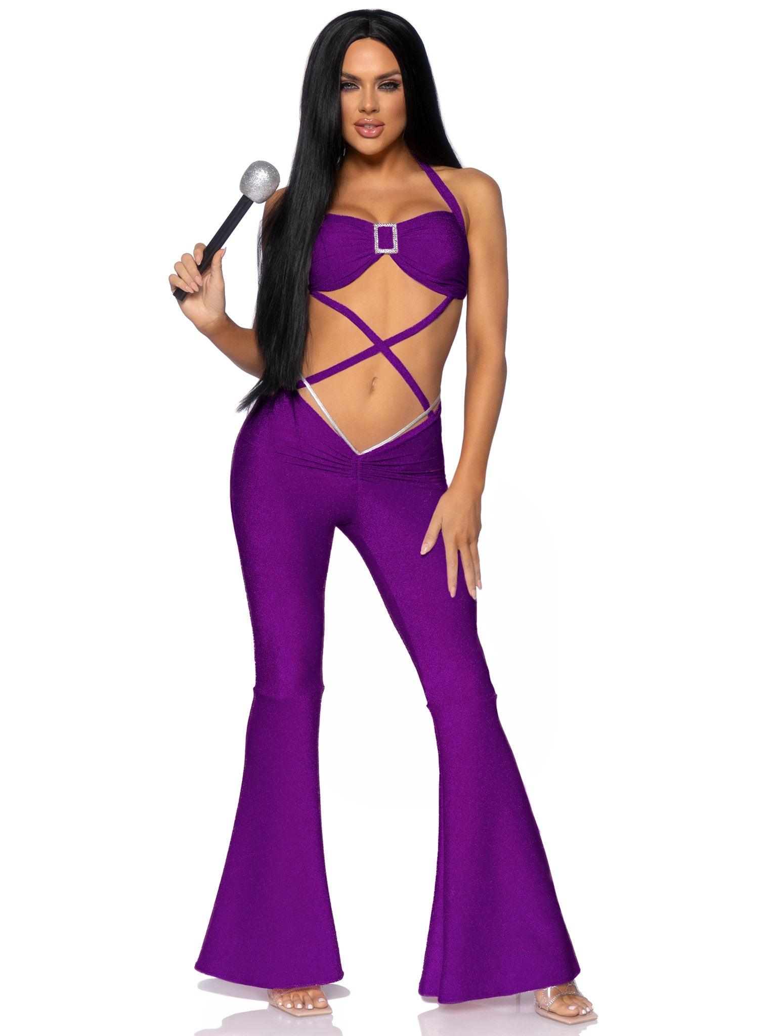 Enter any dancefloor in style with the Leg Avenue Pop Star Costume Set. This standout '70s outfit showcases a shimmering jumpsuit with a strappy waistline, faux rhinestone buckle, and flared legs. The top will turn heads with its halter style, pleated center, and sparkling buckle accent. The bell bottom pants provide a secure fit with elastic waistband, V-cut detail, and alluring silver accent.