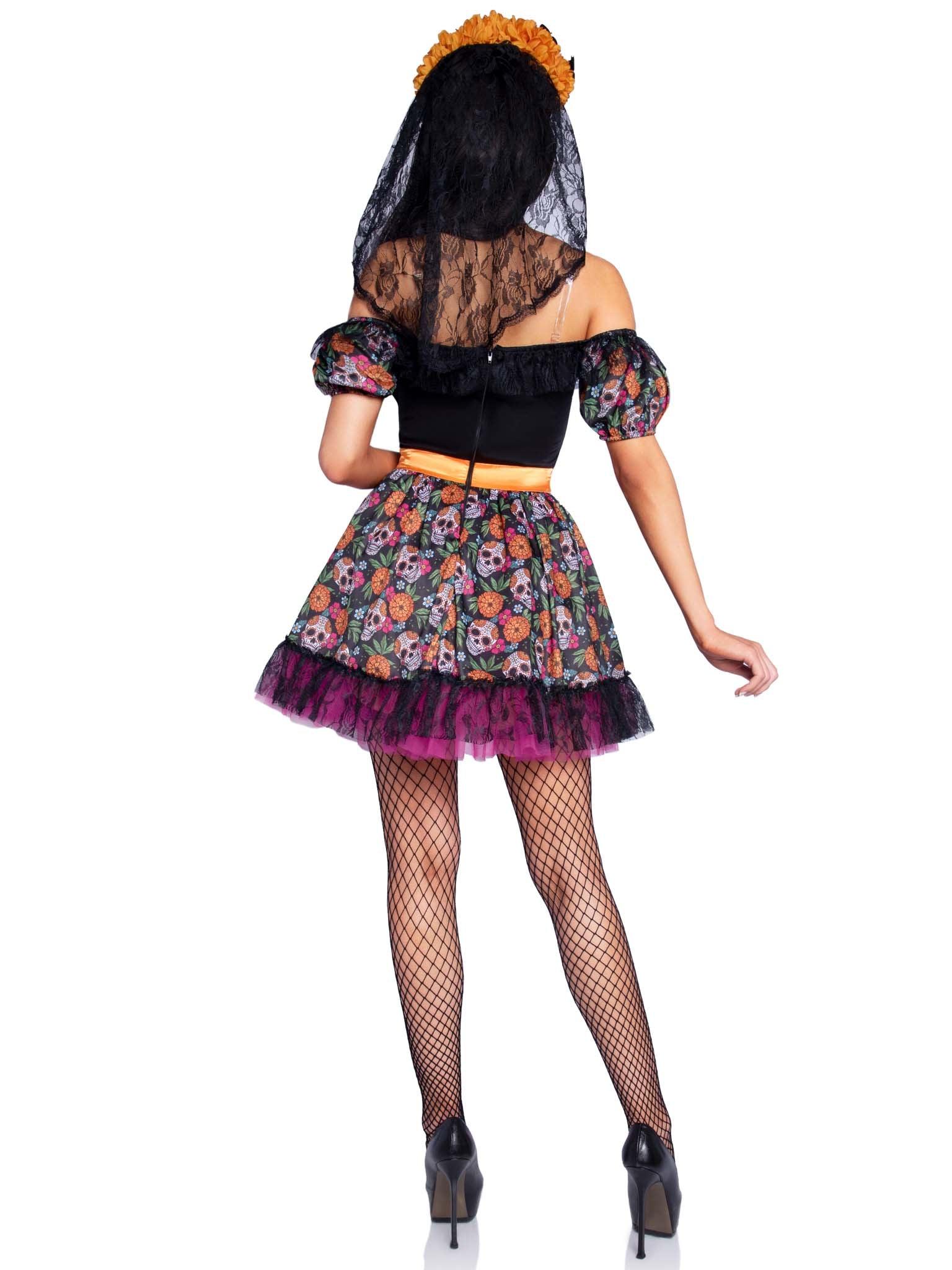 Experience the excitement of the Day of the Dead with the bold Leg Avenue 2-Piece Marigold Catrina Costume Set. The striking costume features a figure-hugging dress adorned with a sugar skull print and lace trim, plus a headpiece with a lace veil and decorative marigold and butterfly accents. The delightful dress showcases a sweetheart neckline, off the shoulder cuffs, and a ruffle-trimmed circle skirt, all expertly finished with lace, colorful flowers, and satin ribbon trim. Experience the enchantment of the holiday with this festively spooky look.