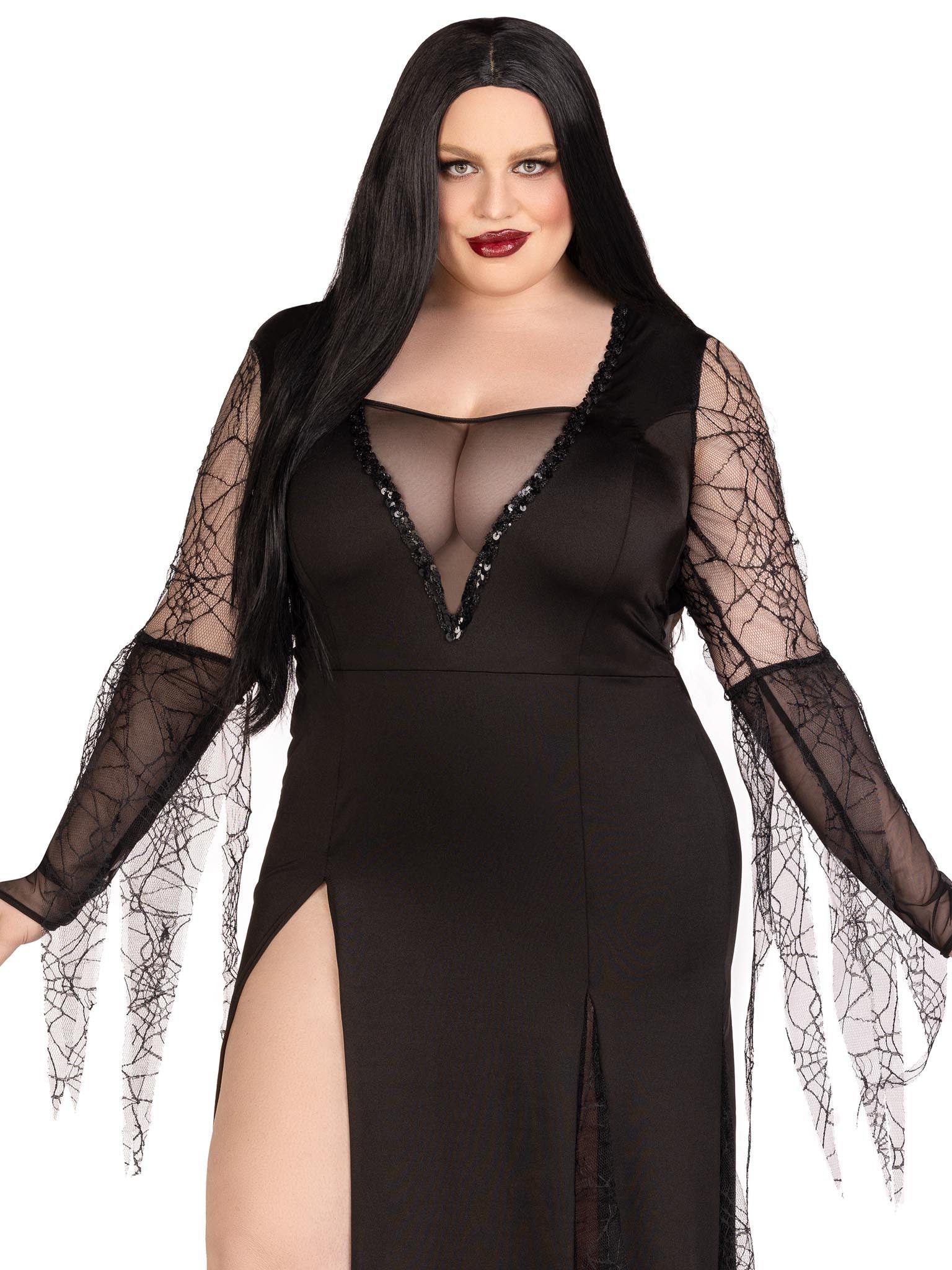 This divine diva commands attention wherever she goes. Snap your fingers for the Spooky Beauty plus size Halloween costume, a stunning ensemble fit for the queen of darkness. This sultry costume features a backless deep-V dress adorned with sequin trim, spiderweb gauntlet sleeves, a ruched back, and a high-slit tentacle skirt. Pair up with your cara mia for an unforgettable couples look.