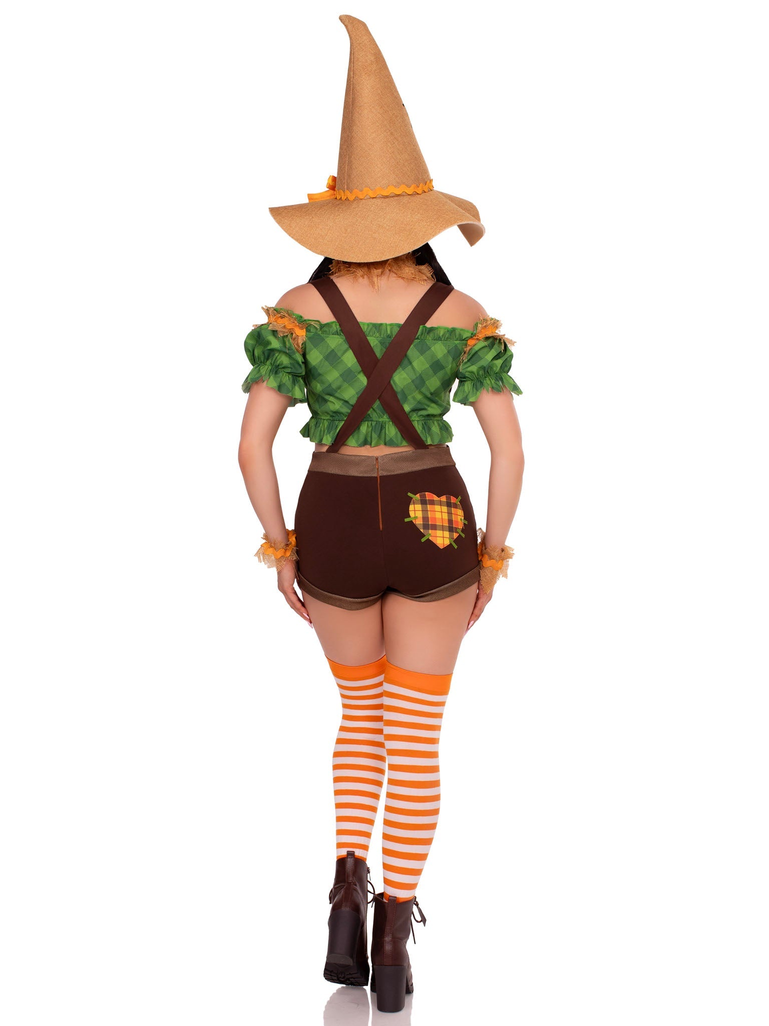 Cute, clever, and just the right amount of unstuffed—the 5 PC Scarecrow Sweetie Costume by Leg Avenue puts a flirty spin on a fall classic. This playful look features a patch-accented crop top and suspender shorts combo, plus wrist cuffs, a choker, and a scarecrow-style hat to complete the vibe. Perfect for solo slayers or part of a yellow brick crew, this is one of those women’s Halloween costumes that turns heads from the cornfield to the costume contest. Great for group Halloween costume ideas, funny Halloween costumes, or anyone seeking a clever twist on classic costume ideas. Thigh highs sold separately.