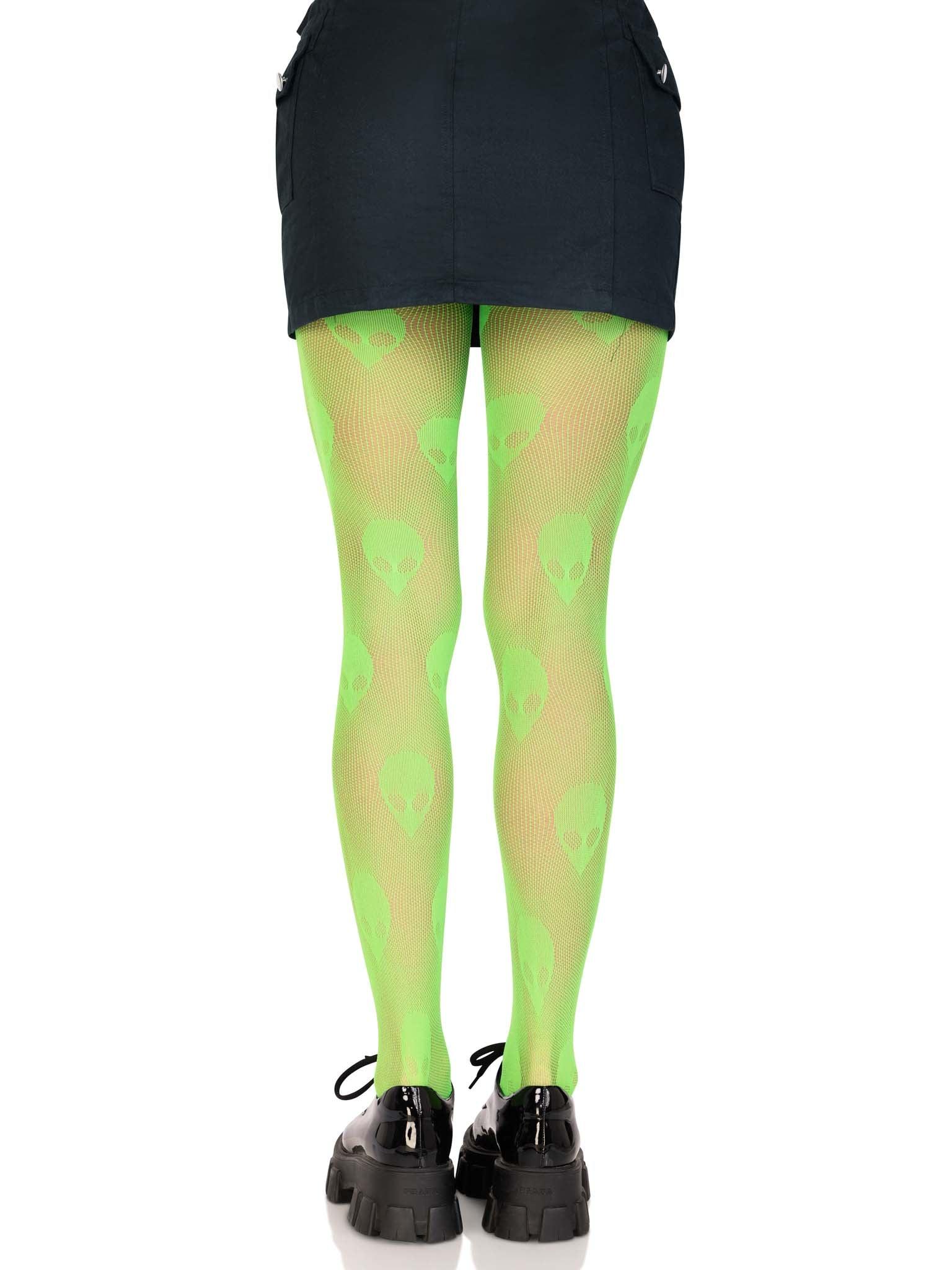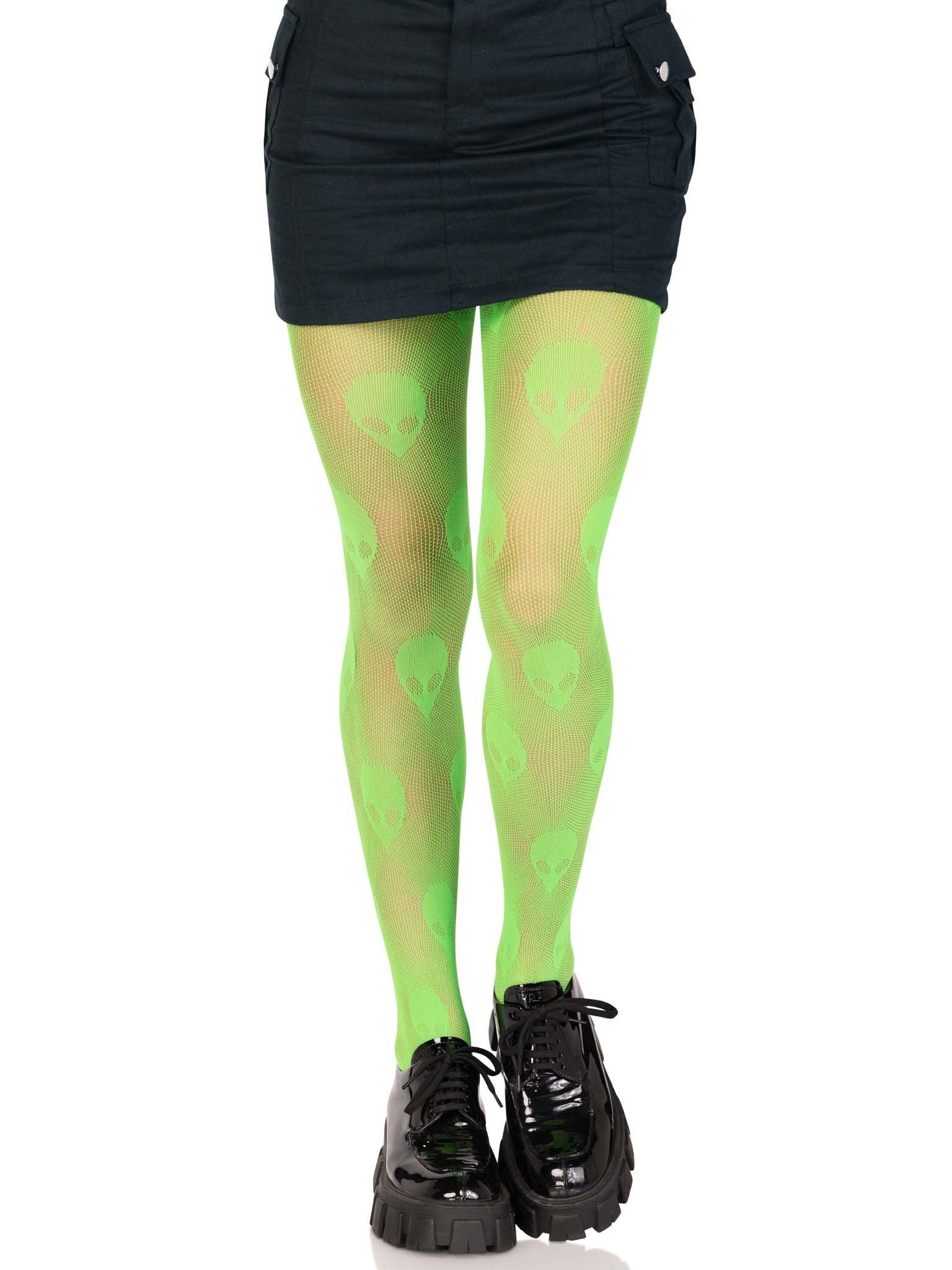 Transport yourself to another dimension with these alien net tights. Featuring a vivid neon fishnet and a woven alien head pattern, these tights are truly out of this world. Perfect for rave outfits, festival attire, Halloween costumes, or just adding a fun twist to your everyday look, these ultra-cute tights let you embrace your playful side and make a bold statement.