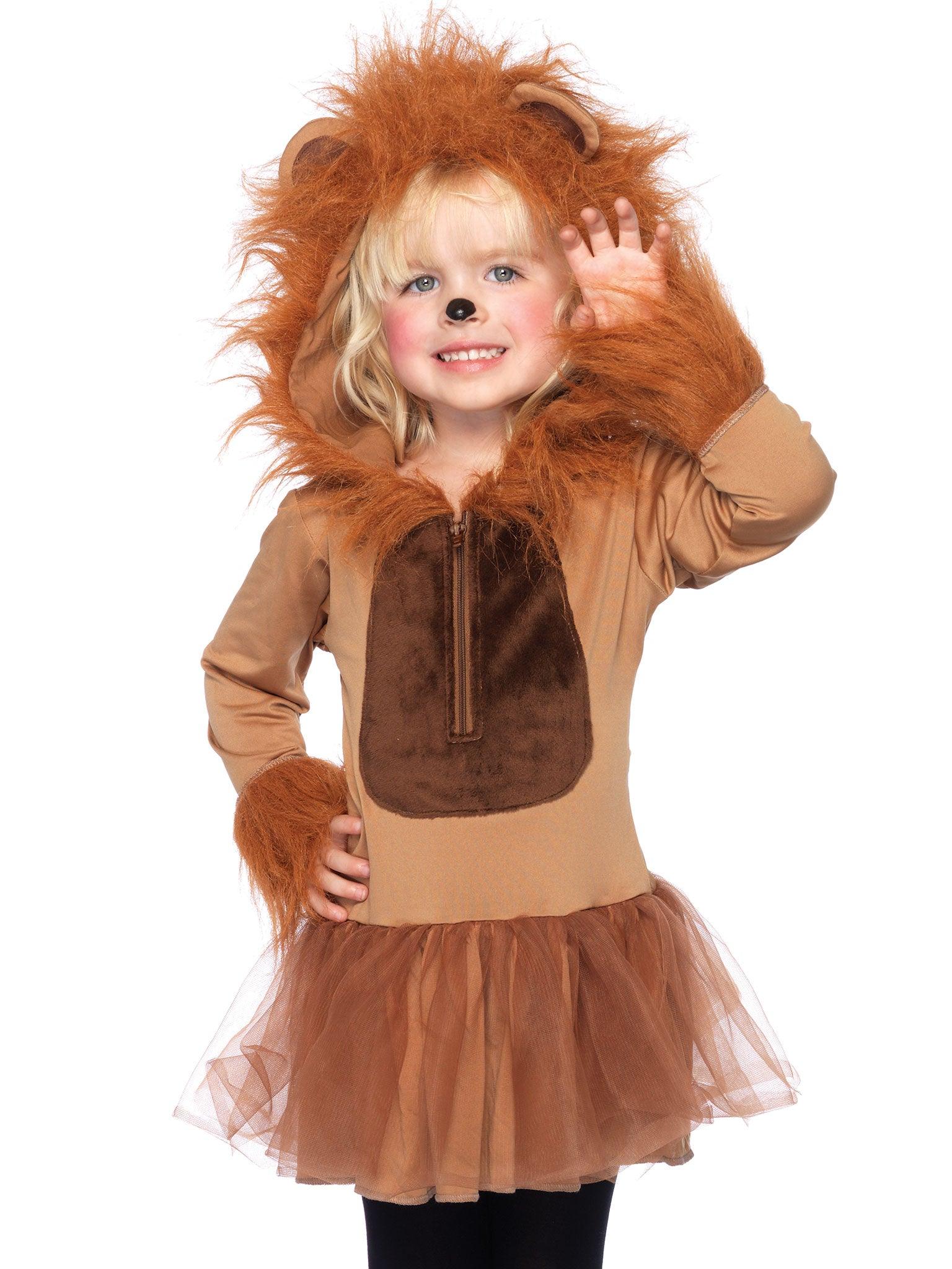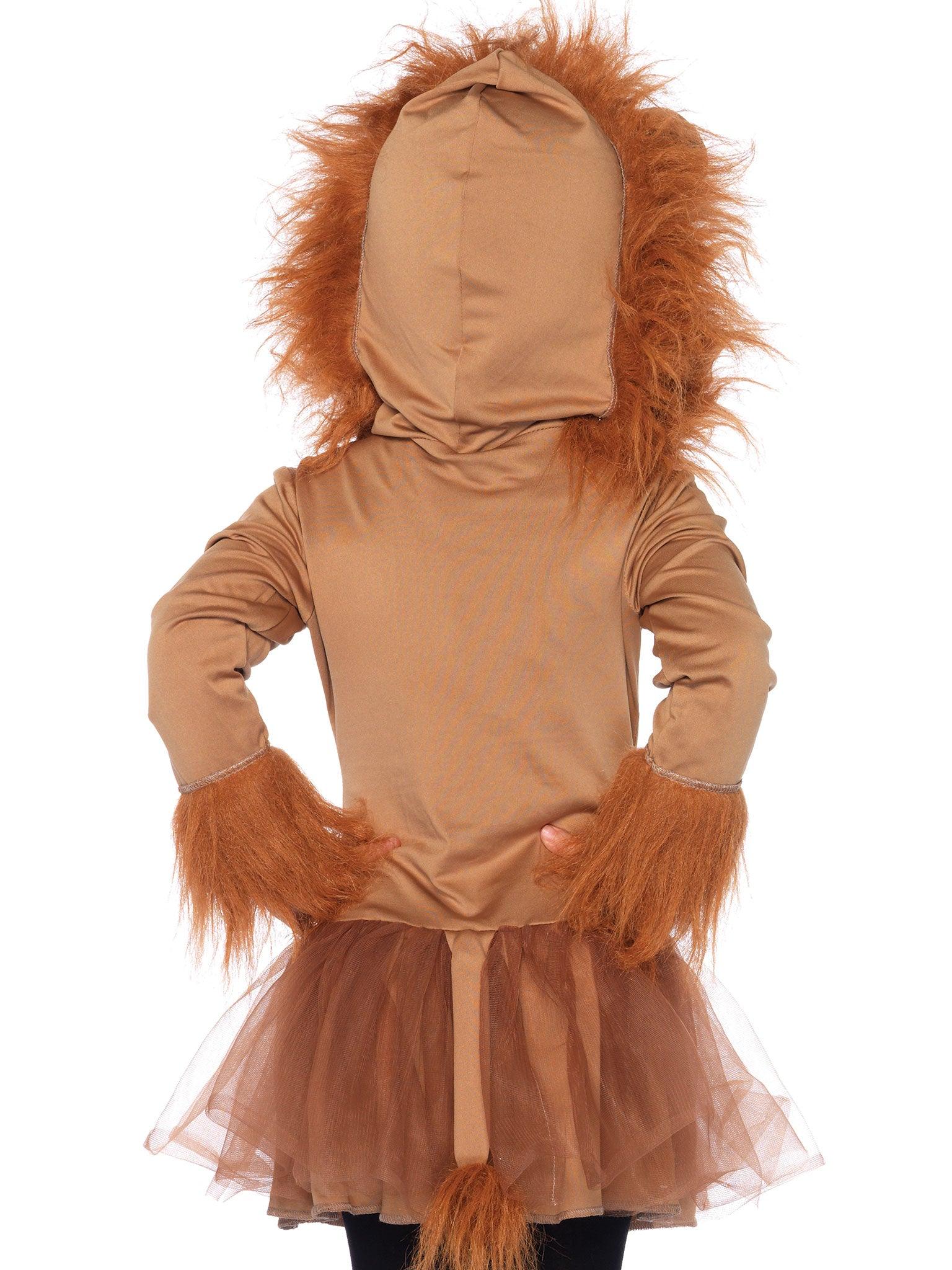 Let their wild side shine in the ultra-cute Cuddly Lion kids' costume. This adorable girls' Halloween outfit features a zipper-front petticoat dress with an attached tail and a furry lion mane hood for extra cuteness.