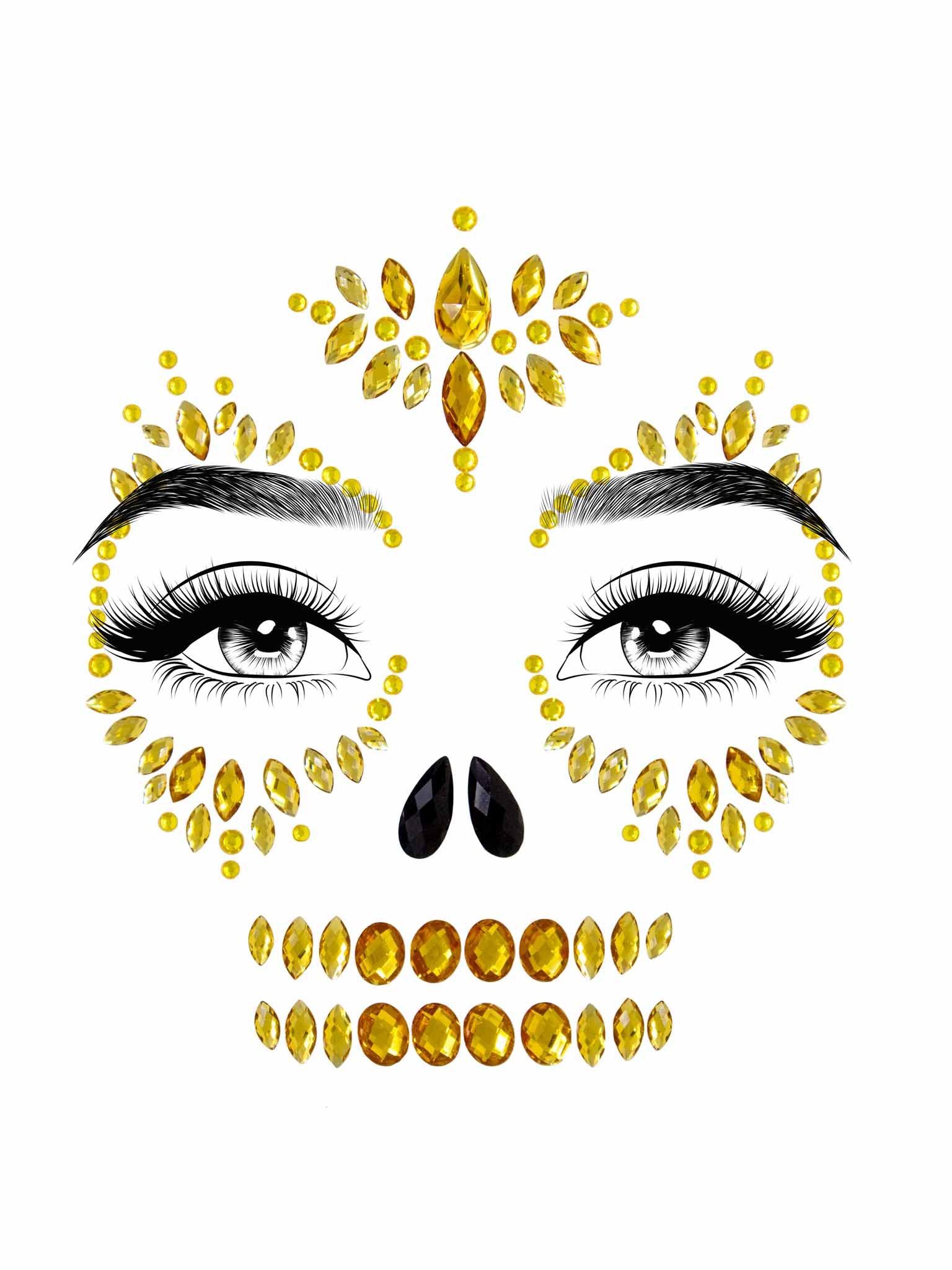 Infuse your costume with the vibrant and bold designs of Día de Muertos using the Sugar Skull Adhesive Face Jewels Set. This set transforms you into the most dazzling skeleton at the party with its unique full-face skeleton design, adorned with glistening golden stones.